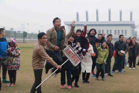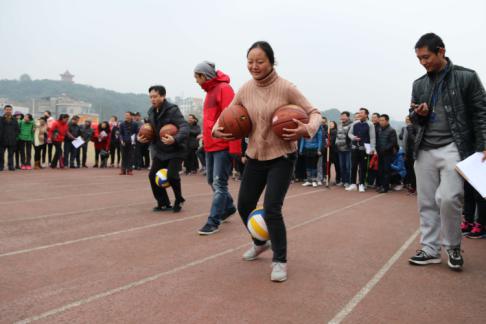 接力赛后紧接着是爱心传递,此项目是对团队协作与速度的考验,老师们俯下身躯,团队合作,球在手中灵活自如。在随后妙趣横生的企鹅漫步项目中,运动员两臂间夹两排球,双腿夹一篮球,老师们夹着球在速度中寻求平衡,摇摇晃晃向终点走去,他们如企鹅般可爱的模样逗乐了现场的观众。而在最后的同心协力项目中,运动员们手挽手,脚绑脚,默契配合,拼尽全力,喊着“一二一“的口号”向终点冲刺,公司最终取得小组第二的好成绩。
