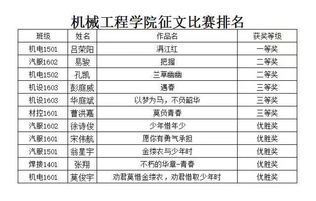 比赛自开始以来,公司全体员工积极参与,踊跃投稿,评委组共收到员工投稿47篇。经过评审团的公平公正评选,最终评出一等奖一名,二等奖两名,三等奖三名及若干优胜奖。其中,来自机电1501班的吕荣阳同学的诗词《满江红》凭借情景交融、灵活用典的写作手法与贴近现实生活的情感描写摘得桂冠。来自汽服1602班的易骏和机电1502的孔凯的作品《把握》与《兰草幽幽》获得并列第二名。